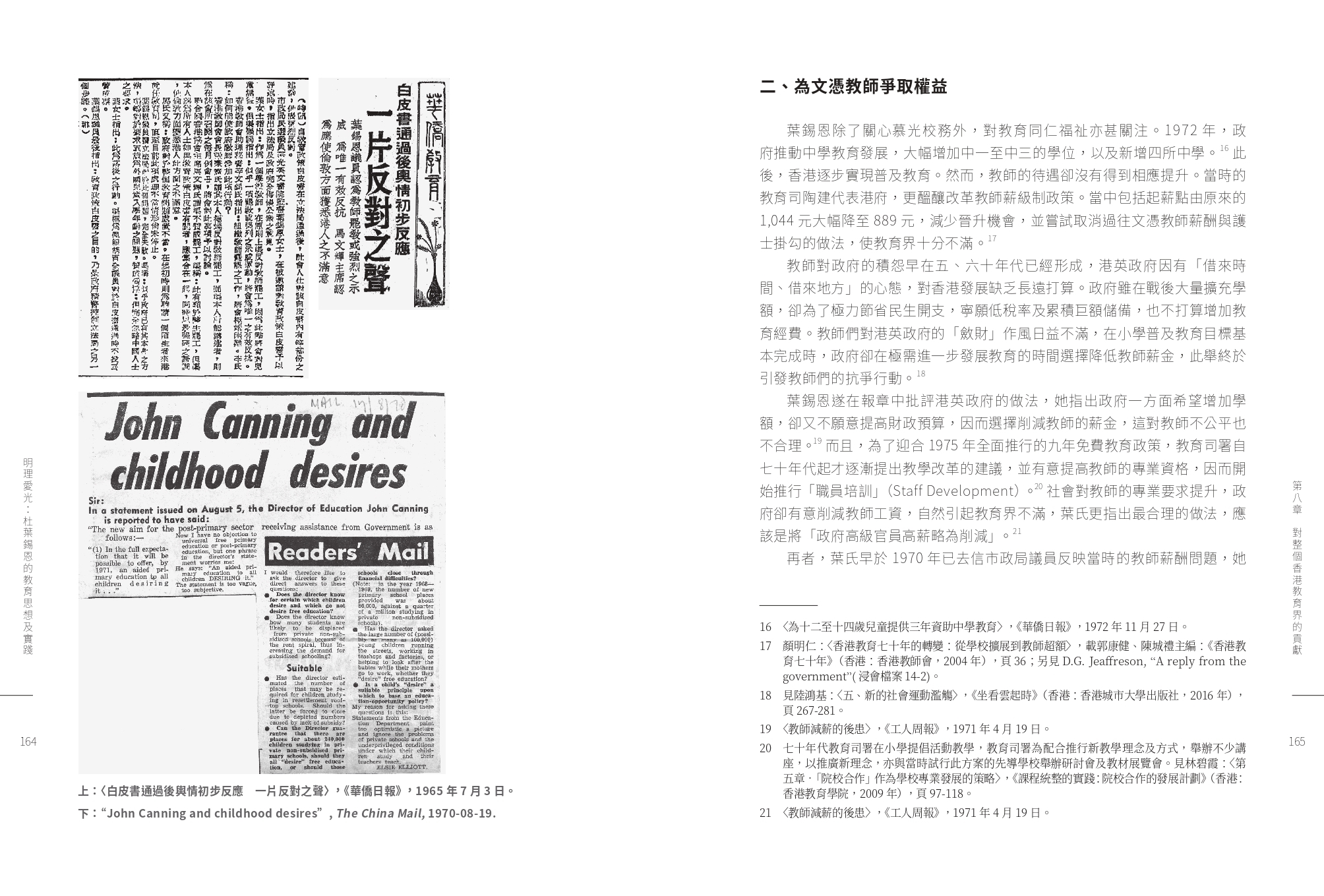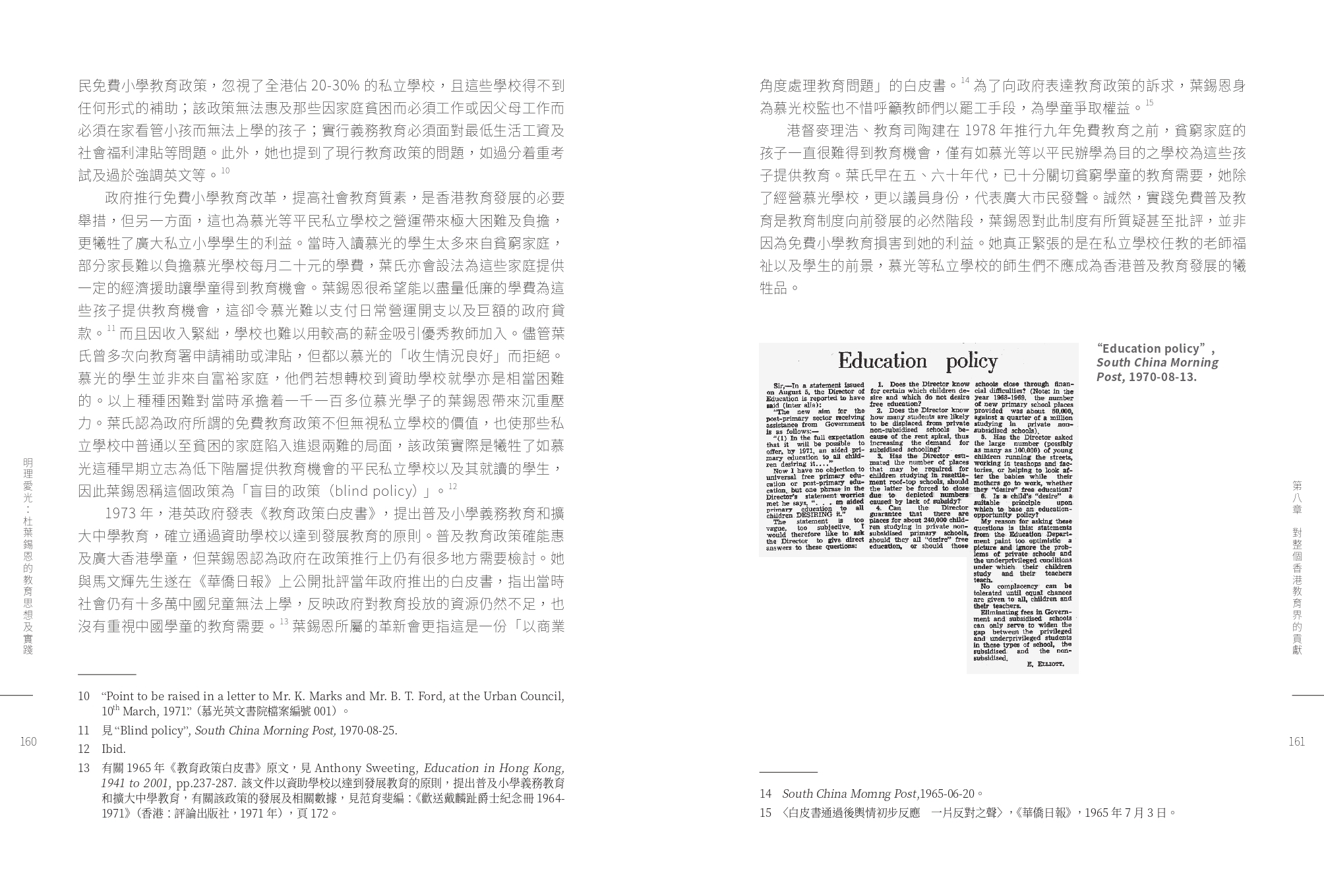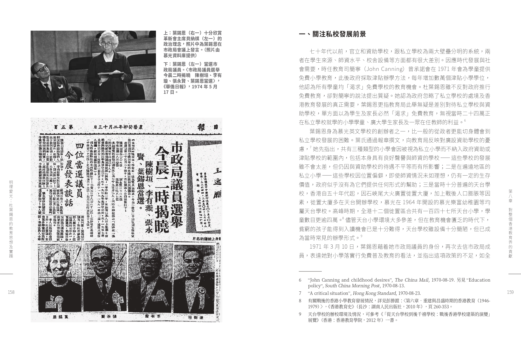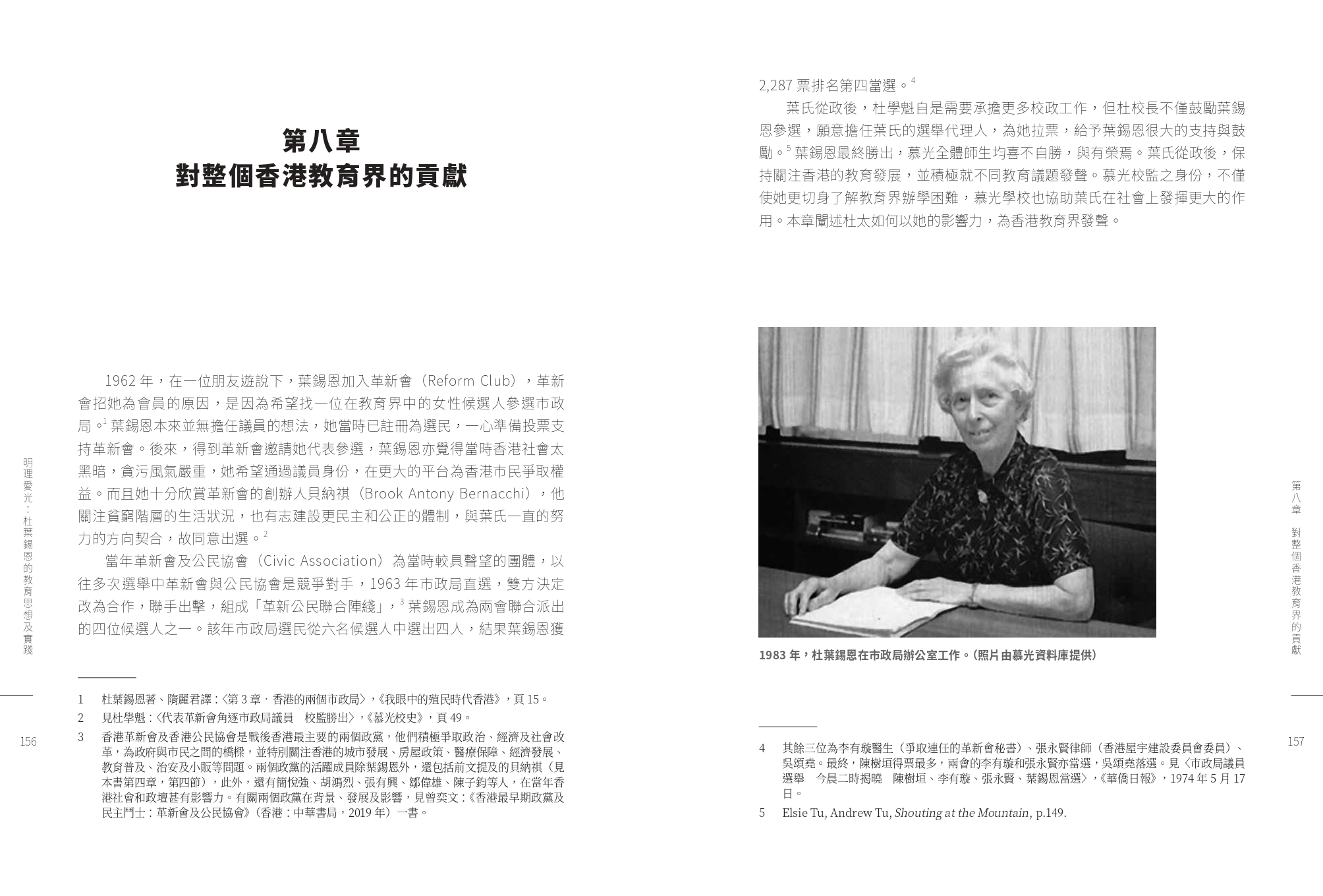 本書為研究香港教育家杜葉錫恩的專著。全書共分十一章,前三章重點敘述她的成長經過,包括求學、信仰及傳道工作,從中突出她堅忍、不屈不撓、不易放棄、關懷民生等優點。第四至八章交代杜葉錫恩如何在艱苦及種種挫折下創辦各所慕光學校及中學的經過,以及申請各種資助,開辦免費診所、為基層人士提供食物、設立公共圖書館等福利事業,同時交代她出任市政局議員,為市民爭取權益,推動教育課程改革、教學語言改革、爭取為少數族裔兒童就學等,為師生謀福利。作者從中分析她的教育理念,肯定她對改善香港基層兒童教育的無私貢獻,公私如一的大愛精神。第九章始,着重敘述杜葉錫恩有教無類的辦學理念及「慕光」五育兼備的教育精神與實踐。作者通過與十四位「慕光人」進行口述歷史訪談,摘錄他們與杜葉錫恩女士的相處經歷及對他們的人生影響,饒有教育意義。書末附件包括大事年表及學生畢業照片等。全書圖文並茂,詳盡敘述一代教育家的成功之由,發人深省之餘,更值得關心教育者借鏡。