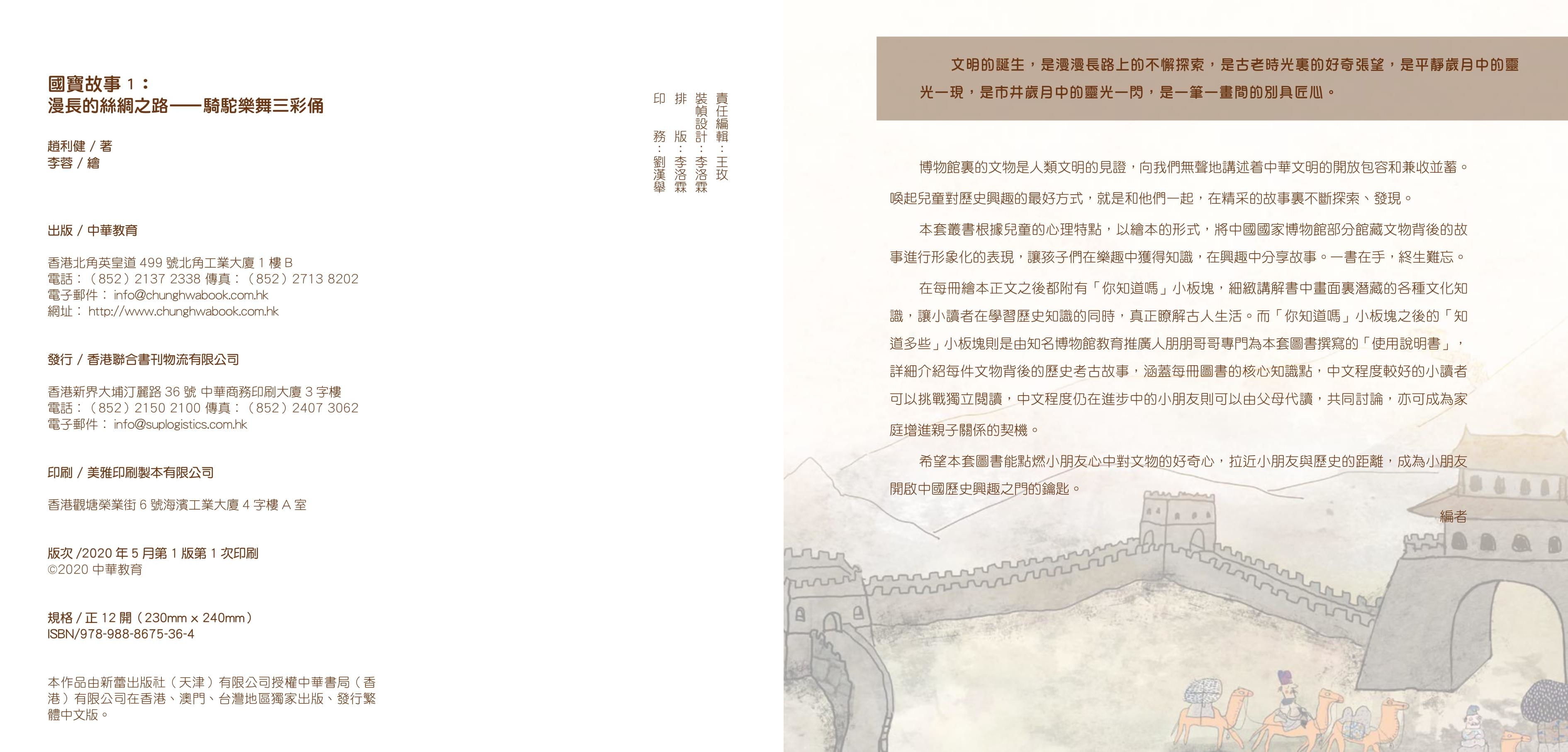本套叢書共分五冊,內容包括反映古代科技成就的陽燧、反映中西方交流渠道絲綢之路的騎駝樂舞三彩俑,反映古人生活方式的世界上很早的冰箱青銅冰鑒、很早的廣告濟南劉家功夫針鋪銅版和展示皇帝祭天宏大場面的大駕鹵簿圖書,勾勒出西周、戰國、唐代、宋代、明代等朝代的不同風貌,將文物背後民族精神的傳承、萬里絲綢之路的壯闊、一代盛世經濟文化繁榮的時代特色濃縮其中。每個故事後配有閲讀指導,幫助家長和孩子理解其中文化內涵。