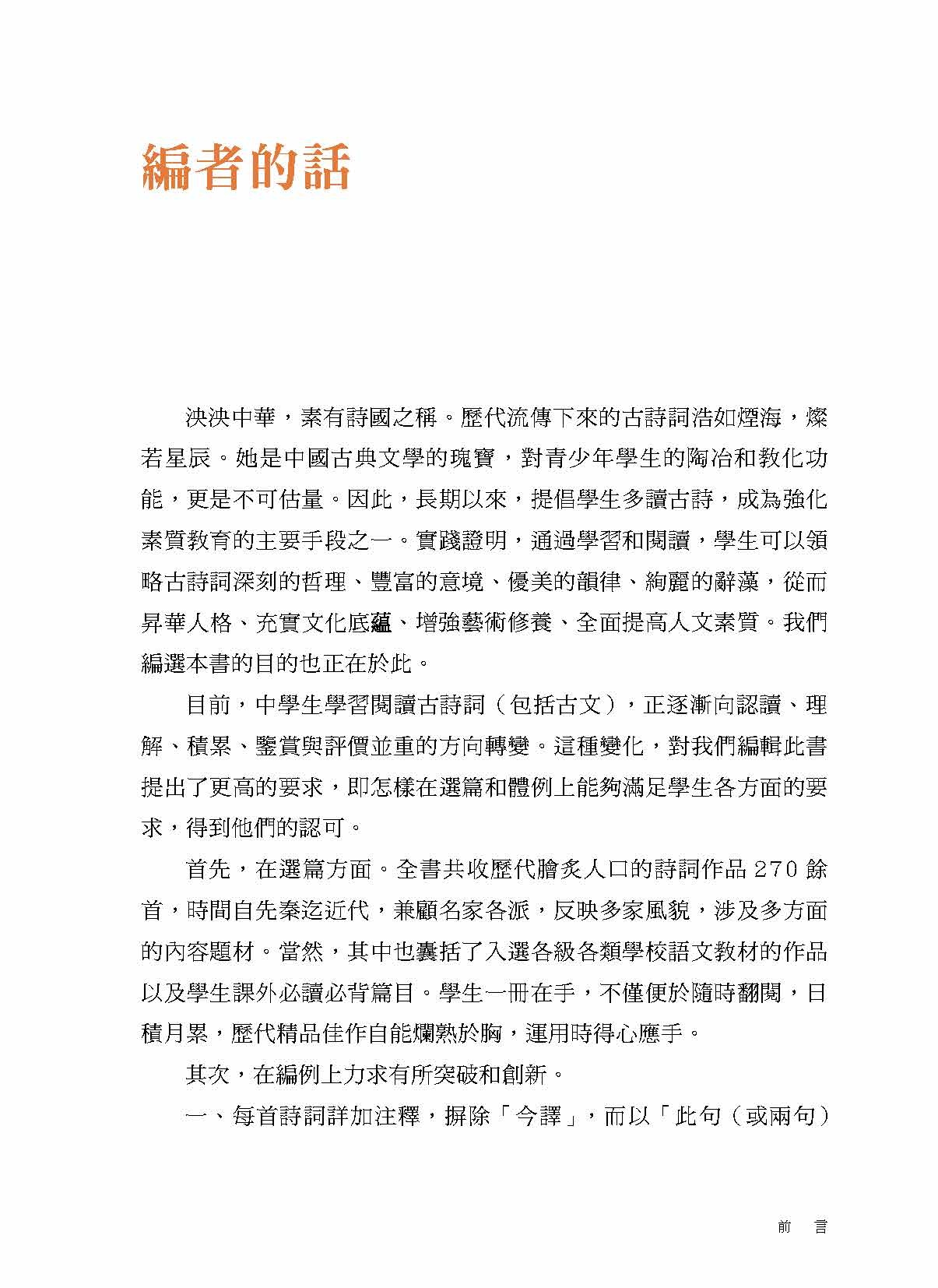全書收錄歷代膾炙人口的詩詞作品270餘首,時間自先秦至近代,兼顧名家各派,反映多家風格,涉及多方面的內容題材。每首詩詞詳加注釋,並設「品賞」欄目,一方面揭示原作的內容題材及所包蘊的思想情感,另一方面從藝術鑒賞角度分析原作的藝術特徵,賞析生動活潑,既起到導讀的作用,又給予學生知識和啟迪。