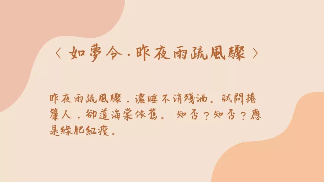 從「綠肥紅瘦」到「人比黃花瘦」,從「倚門回首,卻把青梅嗅」到「不如向,簾兒底下,聽人笑語」。比照李清照前後期的作品,我們領略到詞人的一生遭遇對其藝術風格的深刻影響。