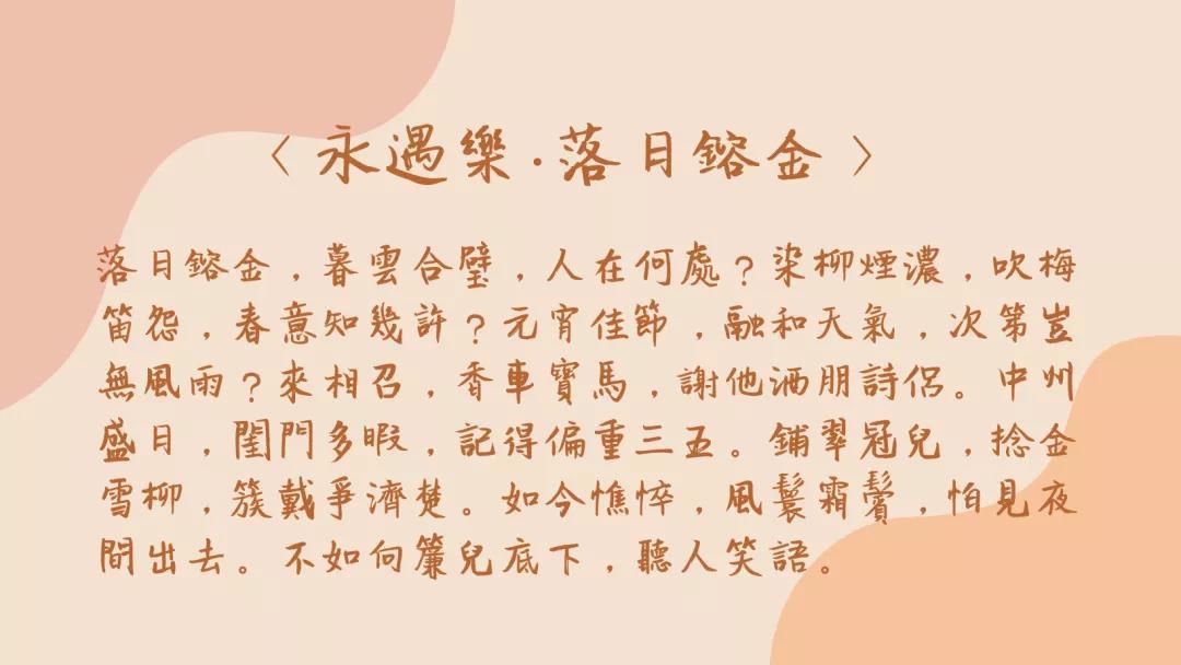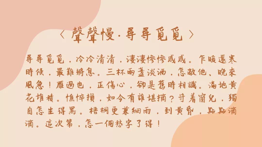 李清照(1084-1155),生於北宋神宗至南宋高宗年間,自號「易安居士」,今山東濟南人。