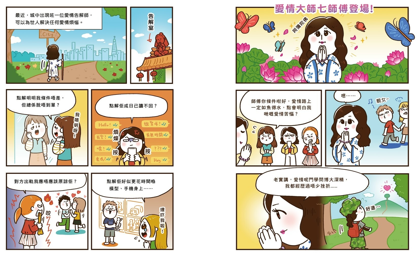 本書的前言是數頁漫畫,以Q版畫風交代了創作動機,形象多變的七師傅今次化身為「愛情告解師」,為讀者指點感情方面的迷津。全書內容則按部就班,先後分為〈單身篇〉、〈結識篇〉、〈相戀篇〉、〈難關篇〉、〈分手篇〉、〈結婚篇〉六部分,分享師傅的愛情觀與智慧。