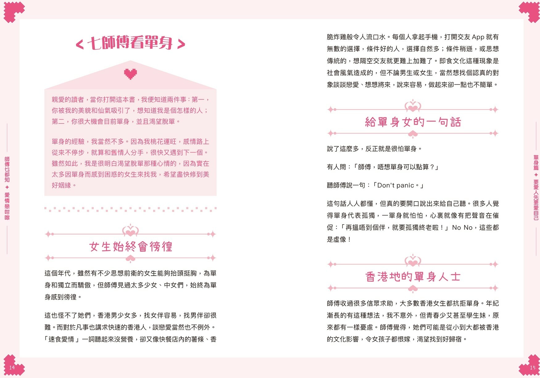 七仙羽(七師傅)按照戀愛的不同進程分成不同章節,分享自己的愛情見聞、豐富及睿智的歷練,指導讀者建立正面的戀愛價值觀,同時輔以適用的風水手法,如占卜、風水陣法等,令你的愛情路路亨通!加上本地插畫師大Y繪畫的可愛漫畫,更加生動貼地!