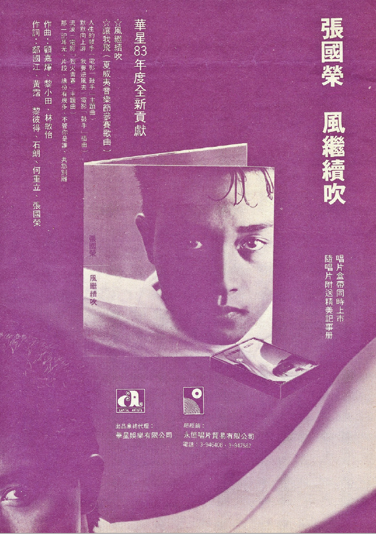 張國榮加盟華星後,於一九八三年一月中推出首張唱片《風繼續吹》。他獲公司器重,採雙封套包裝,由他與陳幼堅合作設計,大膽以他那憂鬱的臉佔據幾近整個封套方框,試問有幾多張臉能具此壓場力量!頸巾跨頁輕揚,柔情千縷。