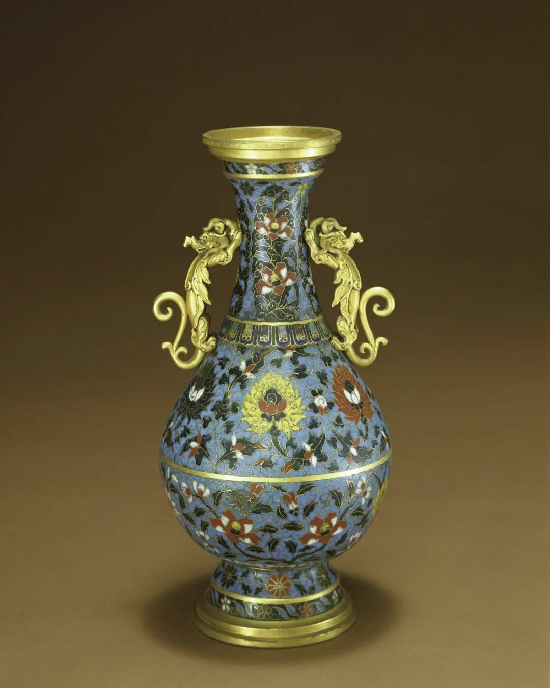 ▲掐絲琺瑯纏枝蓮龍耳瓶