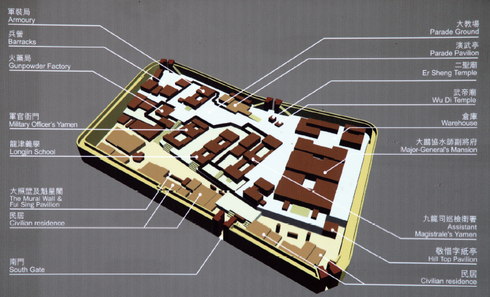 現今一般人所稱的九龍城寨,原名「九龍寨城」。道光二十七年(1847年),即香港島開埠後六年,清廷有感英軍威脅,下令在九龍寨炮台加築城牆防禦。寨城內的主要建築有武官駐守的大鵬協副將府、文官駐守的九龍司巡檢衙署,以及由寨城官員開辦的龍津義學,提供教育之餘,亦作商討民眾事務的地方。