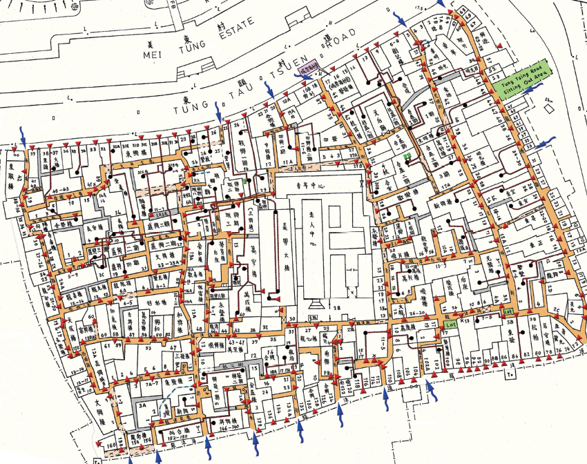 ▲1980年代有城寨居民手繪詳細的城寨地圖,裏面的街巷有如八陣圖,每幢樓宇各有上落途徑。(九龍城寨福利會提供)