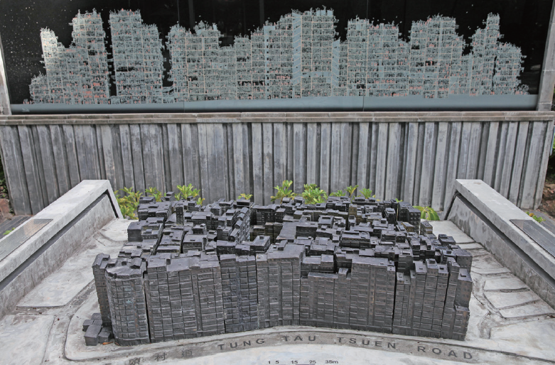 ▲日本考察隊在1992年進入城寨記錄,之後製作銅鑄模型展現清拆前的城寨面貌,背景是當年龍津路的剖面圖。