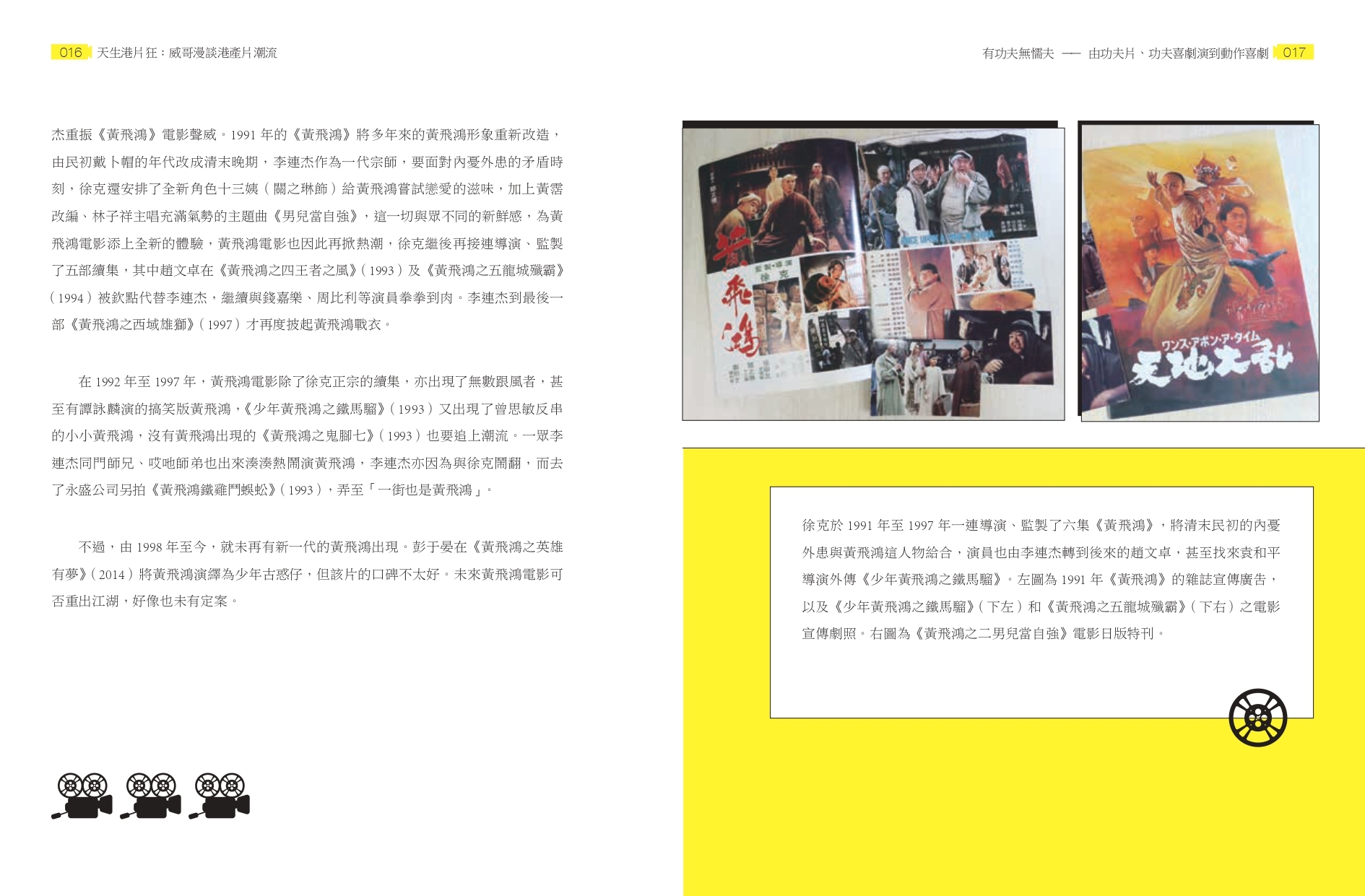 就以第一章〈有功夫無懦夫:由功夫片、功夫喜劇演到動作喜劇〉為例,先由較早期五十年代的動作電影——「黃飛鴻系列」電影說起,原來它不單是香港電影史上推出了最多續集與重拍版本的作品,更創下健力士世界紀錄!而當年參與黃飛鴻電影動作指導的劉湛,其兒子劉家良也接棒了香港動作電影,1978年製作了由成龍飾演少年黃飛鴻的《醉拳》。