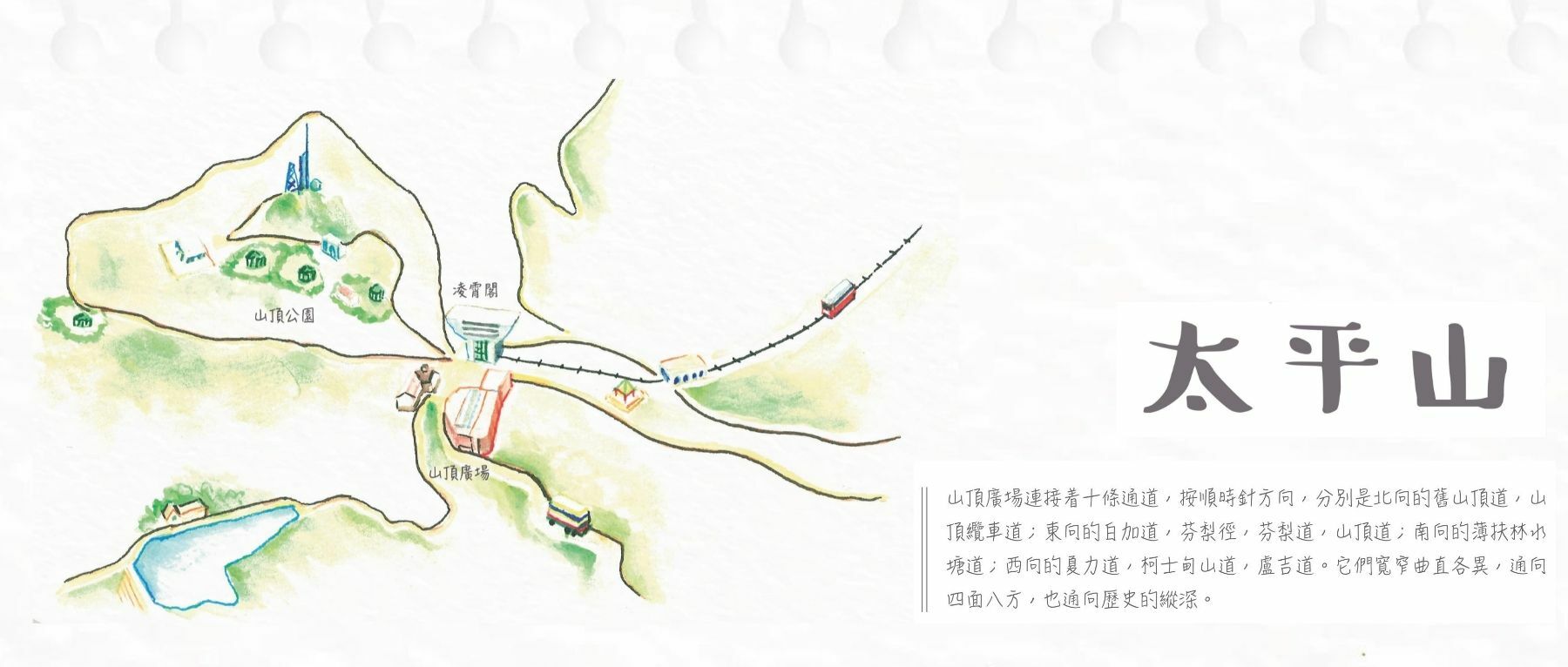 登太平山還有一個引人入勝之處,山頂廣場並不是行程的終點,而只是一個轉折點。如果時間允許,你可以繼續山野之趣,也可以方便地返回市區。這時,你有多個方向、多種方式可供選擇。而你作出的每一個選擇,都會讓你看到別樣的景致,或踏入一段特別的歷史,不經意間領略香江百年風雲的點點滴滴。