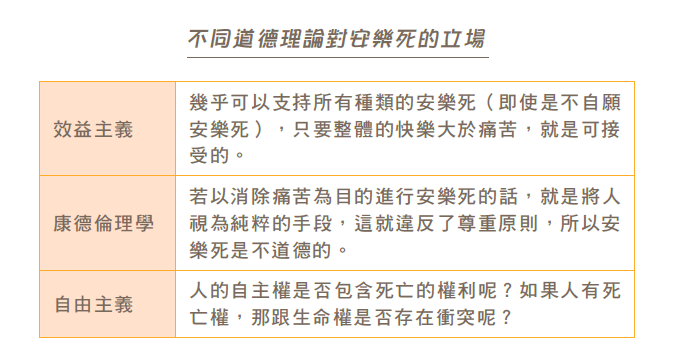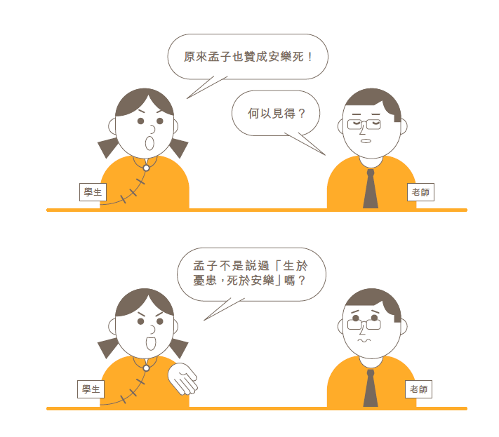 其實「生於憂患,死於安樂」的意思是「人在憂慮和困境中才會發奮圖強,但一旦擔於安逸,就會消亡不振」,跟「安樂死」可謂毫無關係。安樂死一詞是翻譯自英文的Euthanasia,意思是美好的死亡。既然人難逃一死,如果能夠無病痛地安詳死去就最好了。在〈黃金定律〉這一篇提到日本電影《守護天使的失格》,講述一位護理員為解除年老失智症病人及其家屬的痛苦,於是用毒針結束了該病人的生命。這是一部話題之作,針對的是老齡化的社會,電影似乎透露出安樂死是解決問題的方法,也令我想起多年前的另一部日本電影《楢山節考》。