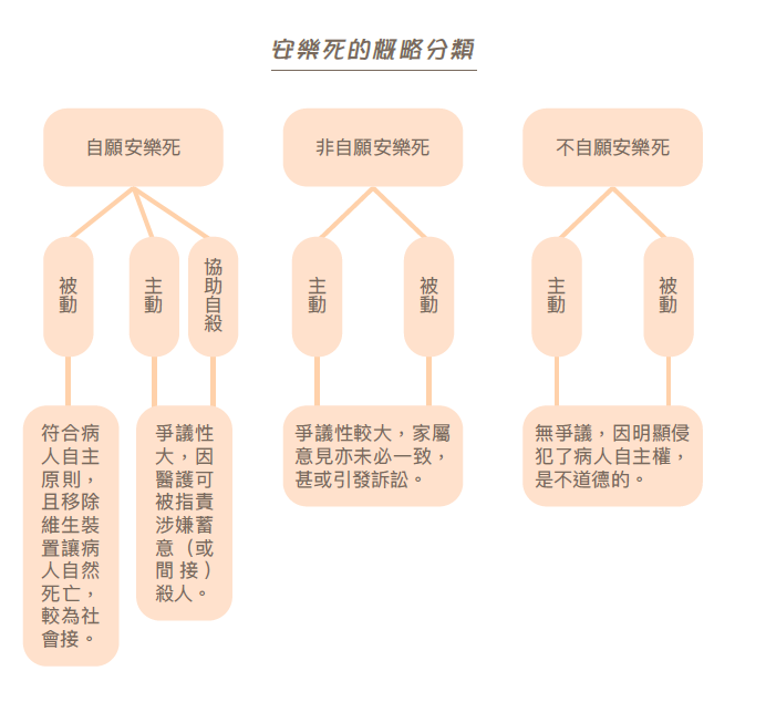 為一清眉目,我們先將安樂死分類。根據病者的意願,安樂死可分為三種:自願、非自願和不自願。自願即是當事人主動要求安樂死;非自願是當事人無法表達自己的意願,由他的家人決定,比如有嚴重先天缺陷的嬰兒、嚴重智障的病人、植物人等;不自願即是當事人不想死,例如當年德國納粹黨就以「安樂死」為名,殺害了很多患上絕症和嚴重殘障人士。根據使用的方法,安樂死又可分為兩種:主動和被動。主動是指醫護人員直接終止病人的生命,例如施打毒針;被動的意思是給病人解除維生系統,或病發時不作施救,讓他們自然地死去。將兩種分類法相配,就可以得出六種安樂死。還有一種叫做「協助自殺」,先由醫護人員安排好一切,然後由病人自己來執行,譬如病人自行服食預備好的毒藥,好處是病人可以在最後關頭改變自己的決定,而醫護人員也可免去「殺人」的指責。