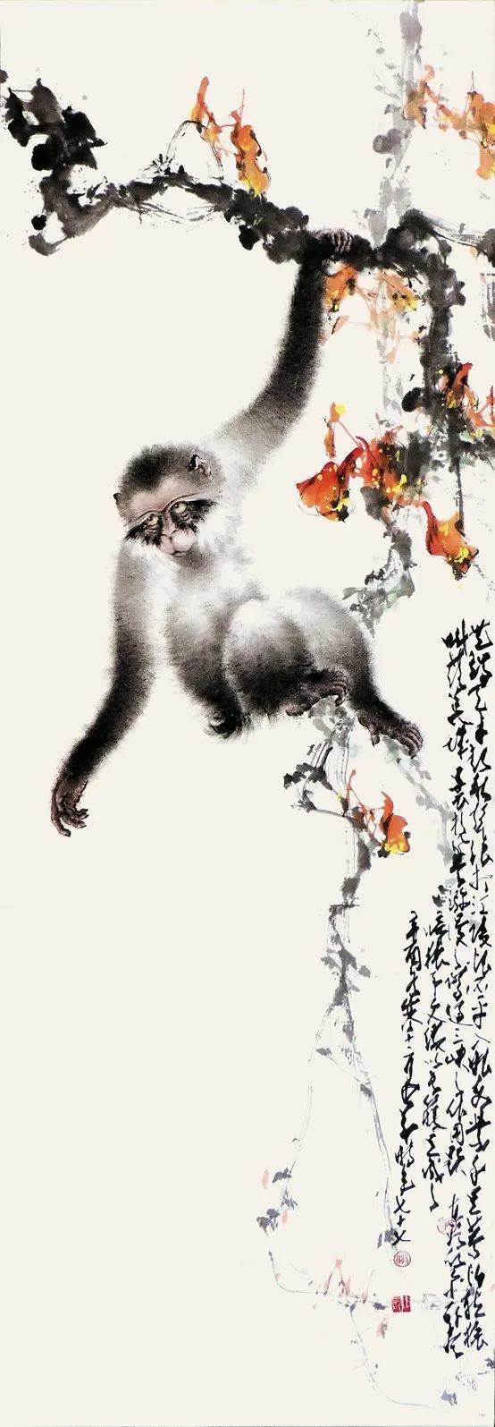 ▲1981年,翁真如繪猿,趙少昂補秋藤並題詞。畫作大小為152x50厘米。