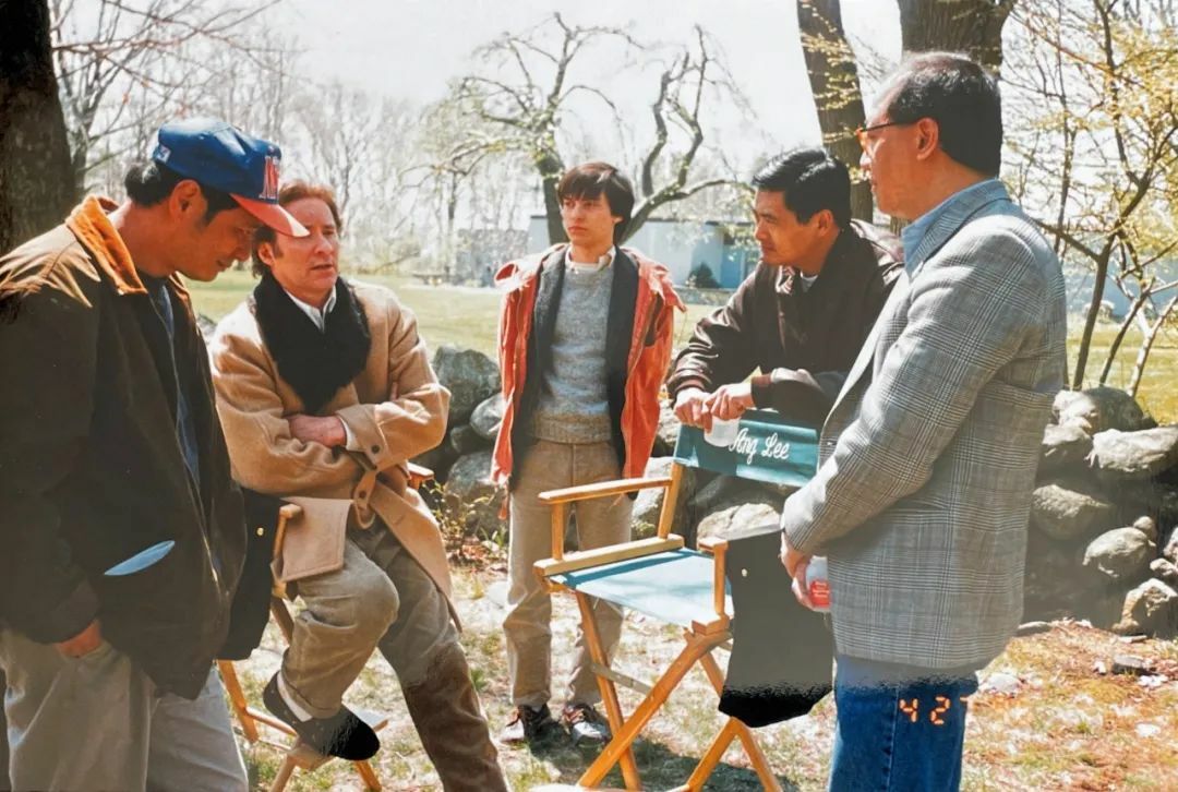 一九九四年四月二十七日,我與周潤發到《冰風暴》拍攝現場探班(從左到右:李安、Kevin Kline、Tobey McGuire、周潤發和我)。
