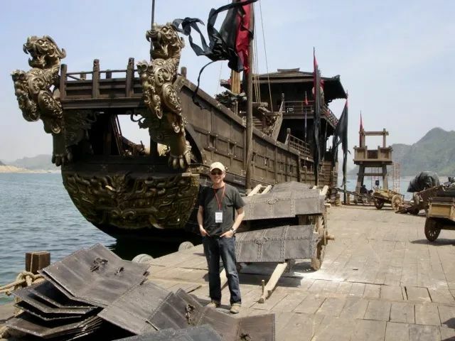 二〇〇七年六月,我們開始拍攝電影《赤壁》。圖為我在湖北易縣《赤壁》外景搭建的曹船旁。