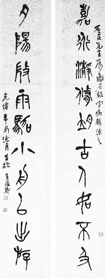 吴昌碩 「嘉道、夕陽」七言聯,紙本灑金石鼓文。
