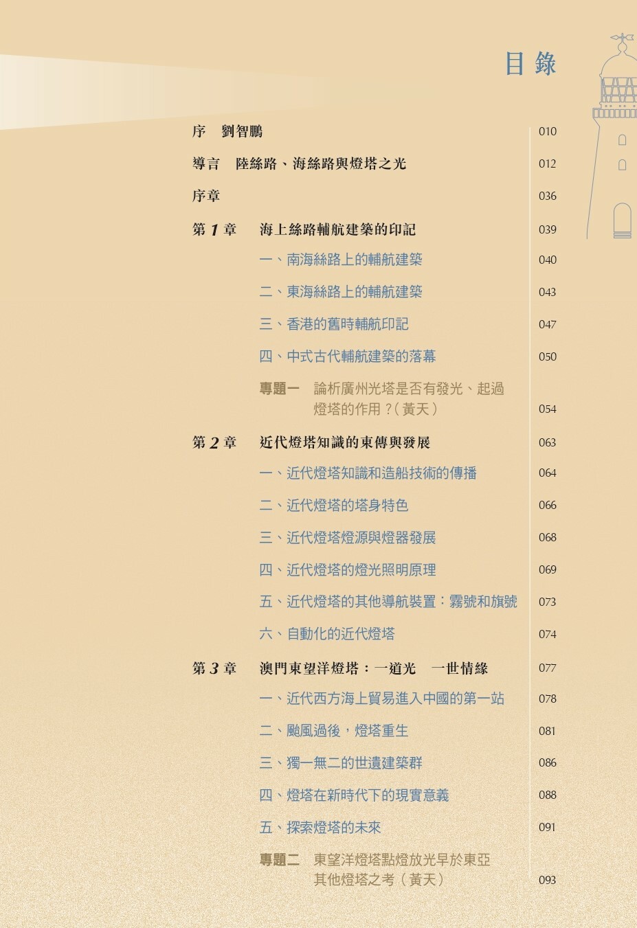 本書先從宏觀出發,介紹海上絲綢之路一帶的古式輔航建築,以至現代燈塔的運作原理和作用,勾勒香港、澳門與海上絲路的歷史聯繫。隨後章節詳細介紹八座燈塔,包括鶴咀燈塔、香港新舊青洲燈塔、黑角頭燈塔、汲水門燈塔、橫瀾島燈塔、燈籠洲燈塔,以及位於澳門的東望洋燈塔,以便讀者全面認識燈塔與中西航運歷史的關係。除燈塔之外,書中也細說了燈塔管理員的守塔故事。