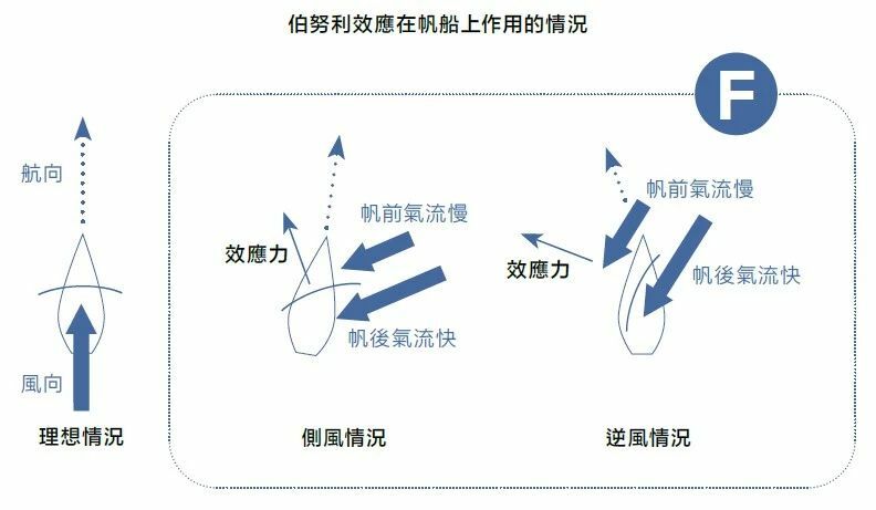 帆船藉助帆的每一面所產生的力量沿着迎風方向移動。迎風面的正向力量(推力)和背風面的負向力量(拉力)一同形成了「合力」,這兩種力量都作用於同一方向就能讓帆船速度達到最快。帆船的航向也不是完全沒有限制,在正逆風左右各約45度夾角內,並無法產生有效的前進力。但太順風也不妙,因這時「伯努利效應」消失,只有風的推力而沒了拉力,船速會再度慢下來,同時也進入不穩定狀態。當船頭與風向成30至40度的夾角時,既有推力又有拉力,此時風的效率是最高的。