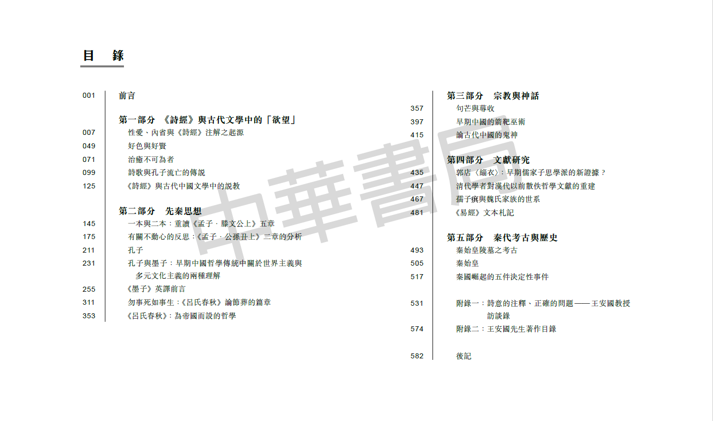 本書收錄王教授自上世紀70年代到2010年間最具代表性的論文,全書共五部分,第一、二部分內容涵蓋《詩經》、《孟子》、《墨子》、《論語》、《呂氏春秋》等哲學思想研究。第三部分收錄他對戰國神靈「句芒」、「蓐收」的考察,以及對古代中國鬼神和箭靶巫術的分析。第四部分以出土文獻如郭店楚簡比對《禮記》文本,以《史記》和《世本》探索孺子與魏氏家族世系,並考察清代學者對哲學文獻的重構和《易經》的爻辭。第五部分從考古學角度論述秦代歷史與文獻,包括秦始皇及其陵墓,以及秦國崛起的原因。書末的王安國教授訪談錄及著作目錄,是漢語讀者認識作者求學與治學的重要文獻,值得細讀。