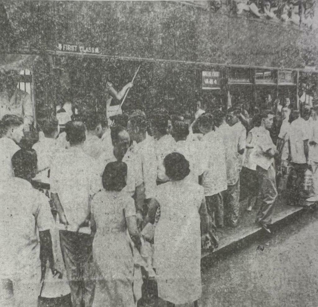 在我們電車工人和很多老香港的記憶裹,以前在頭等車上釘著有一個白牌,牌上寫的是:「此車樓上嚴禁企立,搭客如超過限額者,司機不得將車行駛」。三等車廂也有「搭客不准在車尾企立」九個字,但是,自一九四七年以來,由於搭客人數大量增加,由一九四七年的六千六百萬人增到一九四八年的八千七百九十萬人,以至去年(一九五三年)的搭客人數竟達一億三千六百八十萬人,而電車公司的電車祗從一九四八年的一百零三輛增加到目前的一百三十一輛(實際開出車輛只一百廿輛),即是說,以目前的情況和一九四八年比較,搭客人數增加二分之一人有多,而車輛增加僅得四分之一左右,遠遠追趕不上搭客人數增加的需要,顯出了車輛不足的嚴重問題。雖然以前車上的字牌早就給收起塗抹掉了,但是任誰都不能抹煞搭客擠擁的事實。