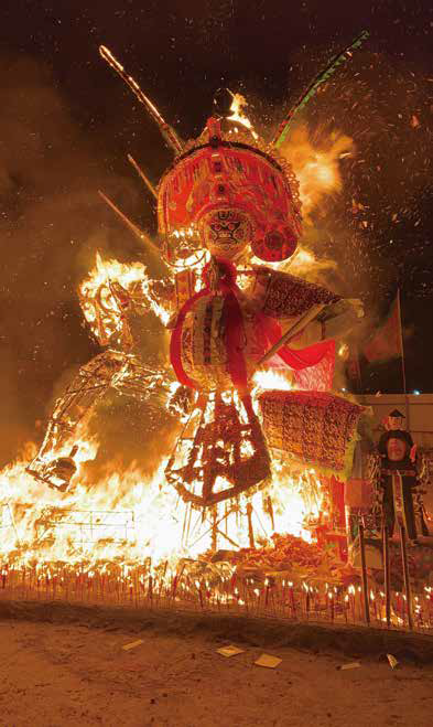 祭祀儀式完成後,相關儀式的紮作品完成使命,之後便會火化。無論是盂蘭勝會還是醮會中的大士王,最後的儀式便是把大士王送走,將其火化,俗稱化大士。以2021年橫洲六村醮會為例,在化大士前大士王要離開醮場在周邊村落走一圈,俗稱大士出巡。這次醮會的紙紮大士王高丈八(近四米),出巡前需要據其重量及行走路線,準備足夠壯丁替換扛抬,才不至影響原定路線及延誤火化時辰。該次出巡路線頗長,扛抬壯丁為盡量省力,步行極速,沿途停靠十個地點,由出巡至返回醮場約一小時。大士王停留點多選擇在村口、空地、橋下和近山野陰暗處。大士出巡主要為了驅除煞氣,潔淨村內「污穢」之地。另外化大士有不同禁忌,有些鄉村規定參與者儀式期間保持肅靜,甚至不容許女性參與;有些鄉村則以長竹桿支撐大士王,避免大士王倒向任何一方,因鄉民相信大士王倒下那一方的村落將會遭殃。出巡完畢,大士王連同幡杆幡燈等紮作品一併火化,同時把村界範圍不潔之物一同帶走。火化儀式代表恭送大士王,跟着鑼更齊鳴,爆竹聲接踵而來,醮會正式結束,可以開齋吃葷。