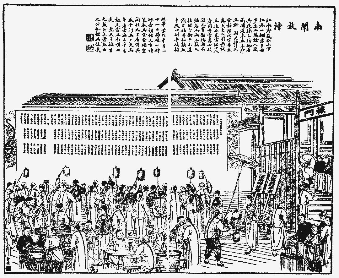 「扛雞」是提拔差的,雞本無力,扛之使得以長鳴。有一種專事冒名替考的槍手,他們十百成羣,隨從學政到各地考棚冒考。在考試之前,如打聽到有二三小姓而其人又無文名的,槍手們則聯合賭徒投買此姓。考試時,槍手混入考場替考生應試,不索報酬,若此姓得中,則考生得功名,投買者得賭彩,兩全其美。