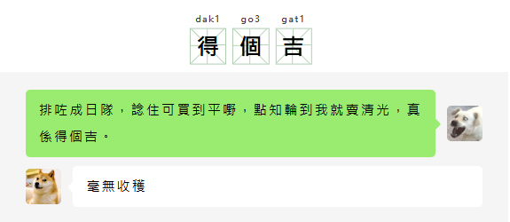 傳說廣州楊巷有間名為「章九同」的綢緞莊,老闆為了推銷產品,在門前設抽獎箱,凡在店內購買了綢緞的顧客,可以有一次抽獎機會,但大部分人抽出的獎券上只有一個「吉」字,並無獎可領。你得個「吉」,我得個「吉」,無人得獎,「得個吉」就成為無收穫之意。