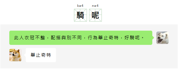 騎呢,應為騎籬蟈。騎籬蟈是一種經常在籬笆頂棲息的蛙類,腰長腳曲,背部有黑斑點,咀闊眼突,樣貌奇醜。一九三三年出版、孔仲南所著的《廣東俗語考》卷十六中有述:「蟈,讀若拐,蛙別名……色青小形而長腰,即騎籬蟈也,因其好騎籬,故名。」因「蟈」音讀「怪」,所以粵人稱之為「騎呢怪」,並以此形容衣着打扮突兀或不得體,又或指舉止笨拙、性格古怪的人士。