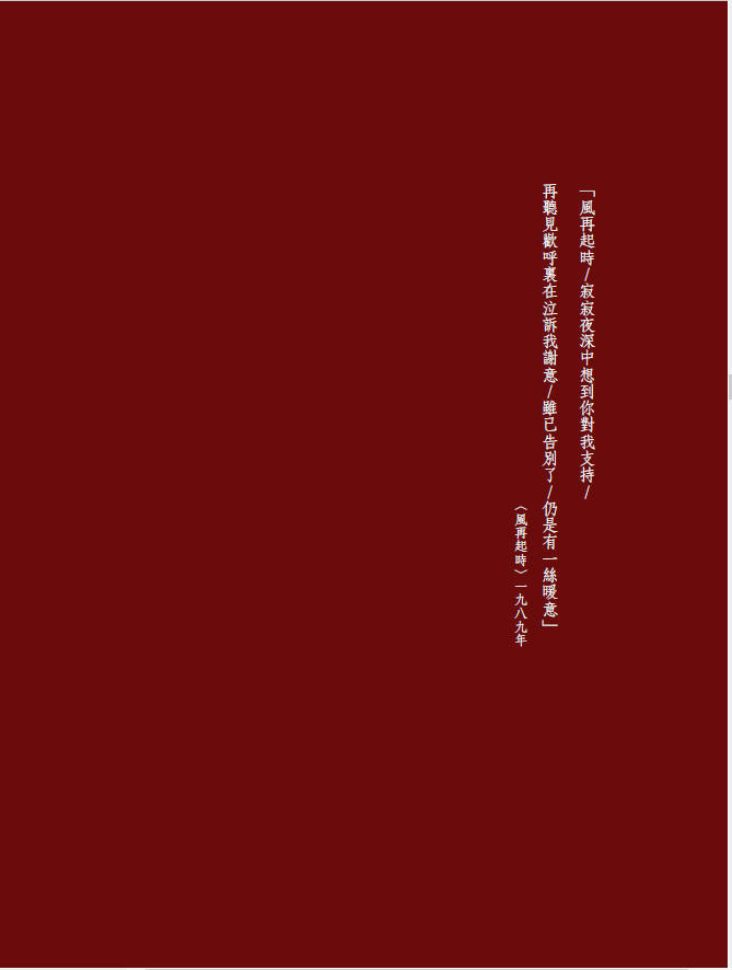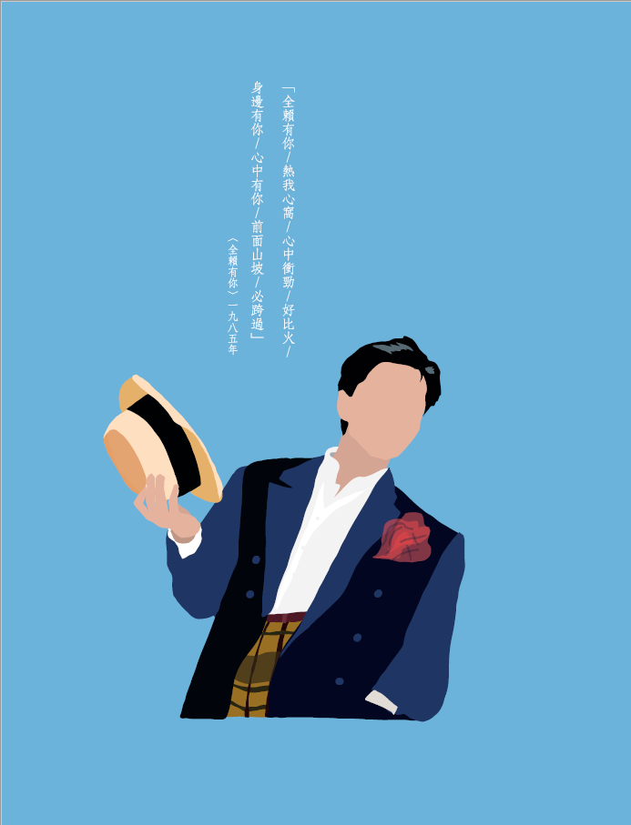 EY:小時候聽到爸爸在播一些八十年代的歌曲,無意之間聽到〈風繼續吹〉。第一個反應是覺得這首歌很特別,那時候應該大概六歲。之後斷斷續續也有聽到哥哥的歌。直到長大後,剛懂得上網,就會自己上網去找一些哥哥的資料。大概兩三年前吧,有一次和家人去看《家有囍事》(按:復修加長版),那時候就被他飾演的角色常騷吸引住了。常騷很「姣」,但我從沒有覺得反感。〈風繼續吹〉到現在仍然是我最喜歡的歌,這首歌不單歌詞和旋律優美,我以為這首歌也代表着他的一股風潮,會繼續吹下去。哥哥好像風一樣,一直在我們身邊,永遠陪伴着我們。這首歌對我來說非常有意思。