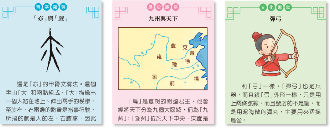 本字典設有三種知識欄目,以輕鬆有趣的手法解説文言字詞、歷史及文化知識,包括: