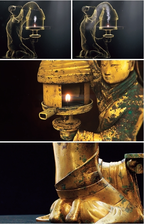 西漢時,人們常用動物脂肪製作燃料,燃燒時黑煙彌漫,氣味難聞。釭燈內部的空腔是漢代人實現環保的訣竅。長信宮燈點燃後,煙隨熱氣流順衣袖進入空腔,過程中温度逐漸下降,煙炱便附着在內壁,避免彌散,保持空氣清潔。燈體的組合部件可以拆卸,底部開敞,便於清洗內部。控制光亮,這尋常的需求被創造出超凡的精緻,在燈盞明滅、煙霧宛轉中,我們見證前人的心意與考量。時間似光,生命如燭,長信宮燈帶來靈動的光亮。