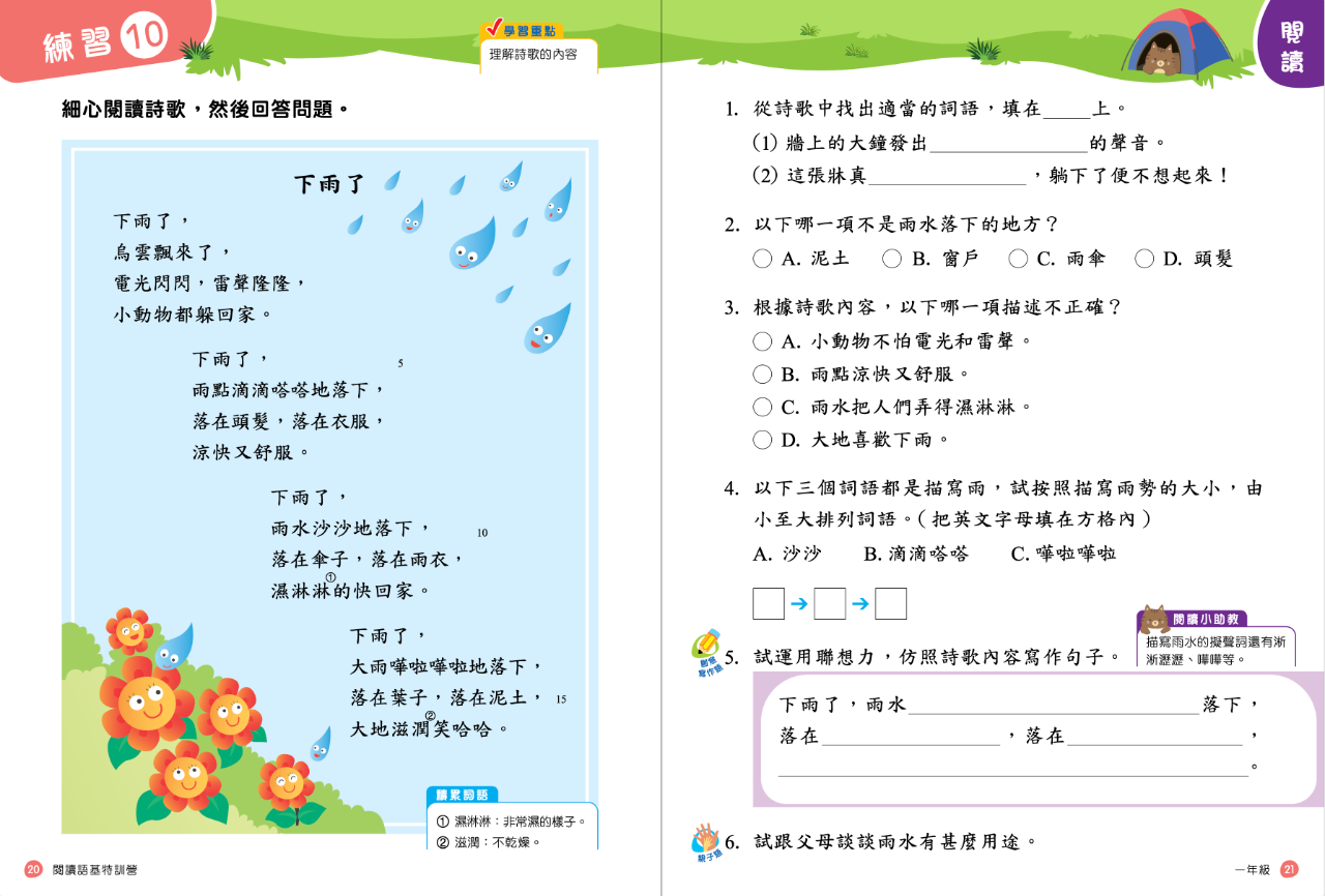 閱讀練習還設有兩種特別題型:「親子題」和「創意寫作題」。親子題專為一年級至三年級而設,讓年幼的學生和家長有更多親子互動交流,使學生在家長的幫助下打好閱讀理解基礎,培養為人處事的品格。「創意寫作題」以讀帶寫,讓學生通過仿作發揮想像,學習寫作的技巧,同時訓練閱讀理解能力。