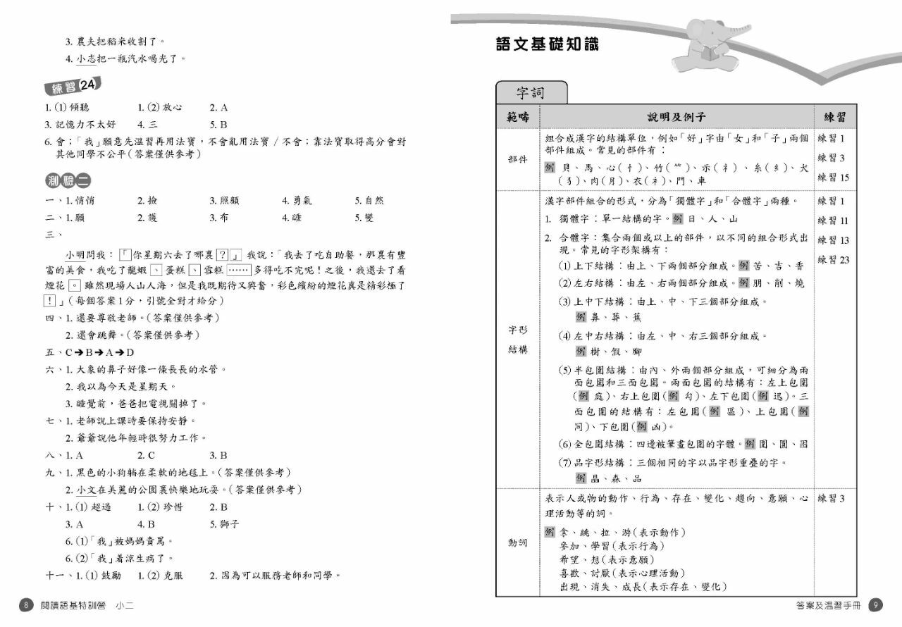 每冊附送一本小冊子,備有「語文基礎知識」,重點解說語文基礎知識定義和例子,讓學生重温所學。另備有參考答案,供學生自學之用。