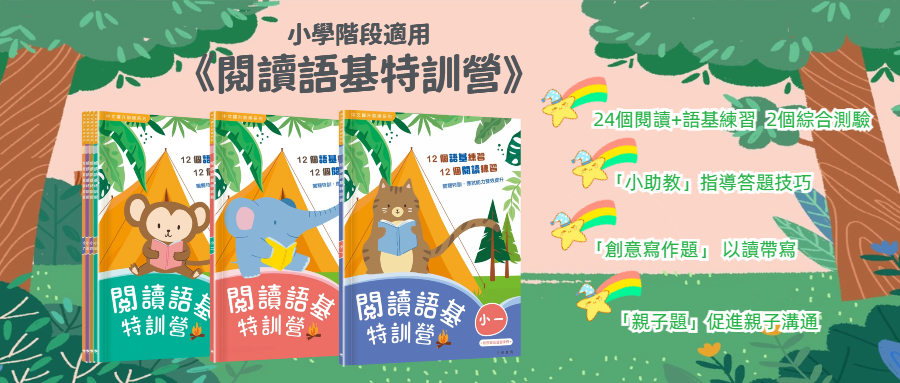 「中文躍升訓練系列」繼《閱讀小學堂》後再有新補充教材推出—《閱讀語基特訓營》。這套練習根據《小學中國語文建議學習重點》編輯而成,以提升香港小學生的閱讀理解和語文基礎知識能力。全系列六冊,一年級至六年級各一冊。每冊24個練習,包括12個閱讀理解練習和12個語文基礎知識練習,以及2個綜合小測。