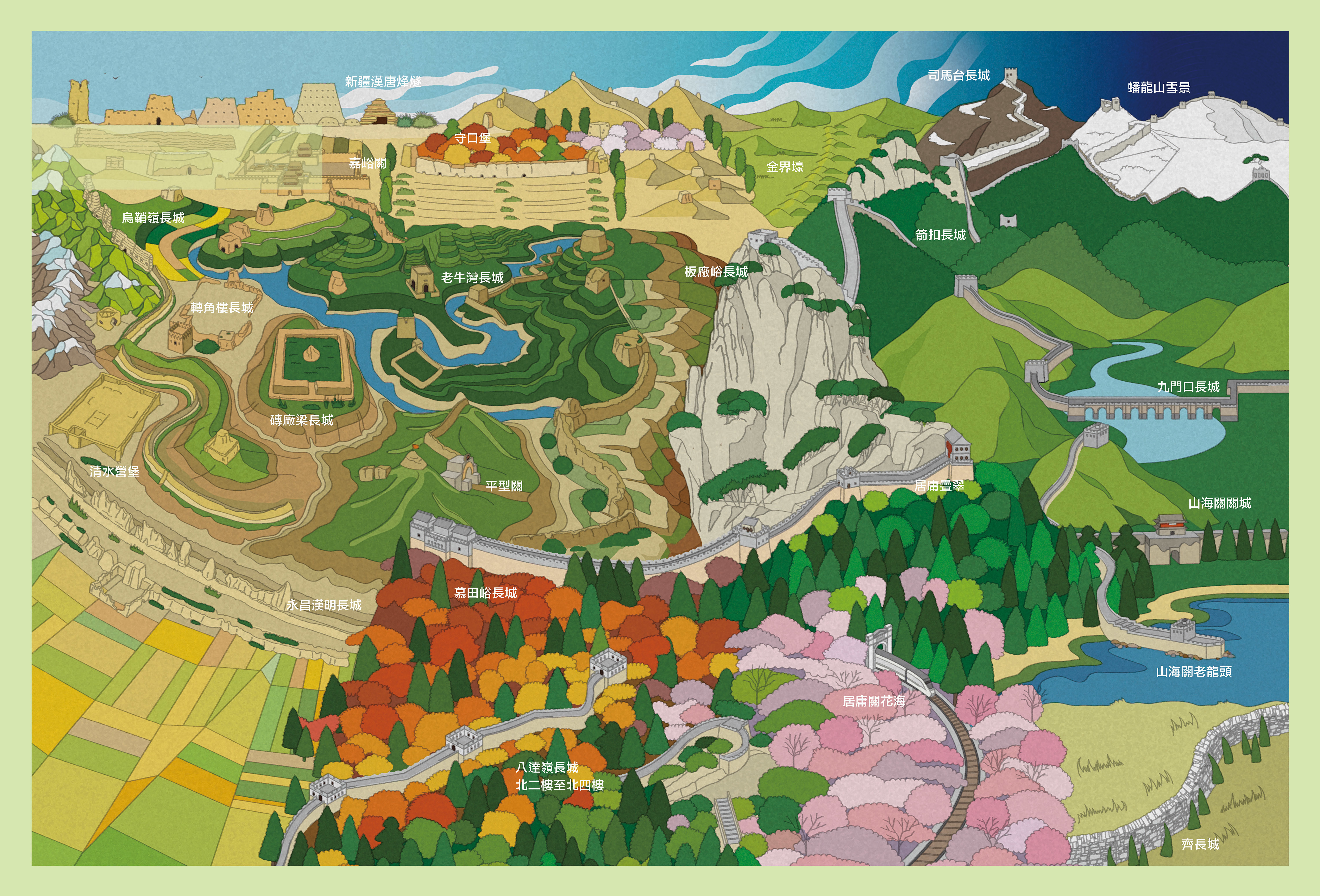 我們貪心地把全國各地一些經典的長城景觀都拼貼在這張圖上,你能從中找到哪些呢?