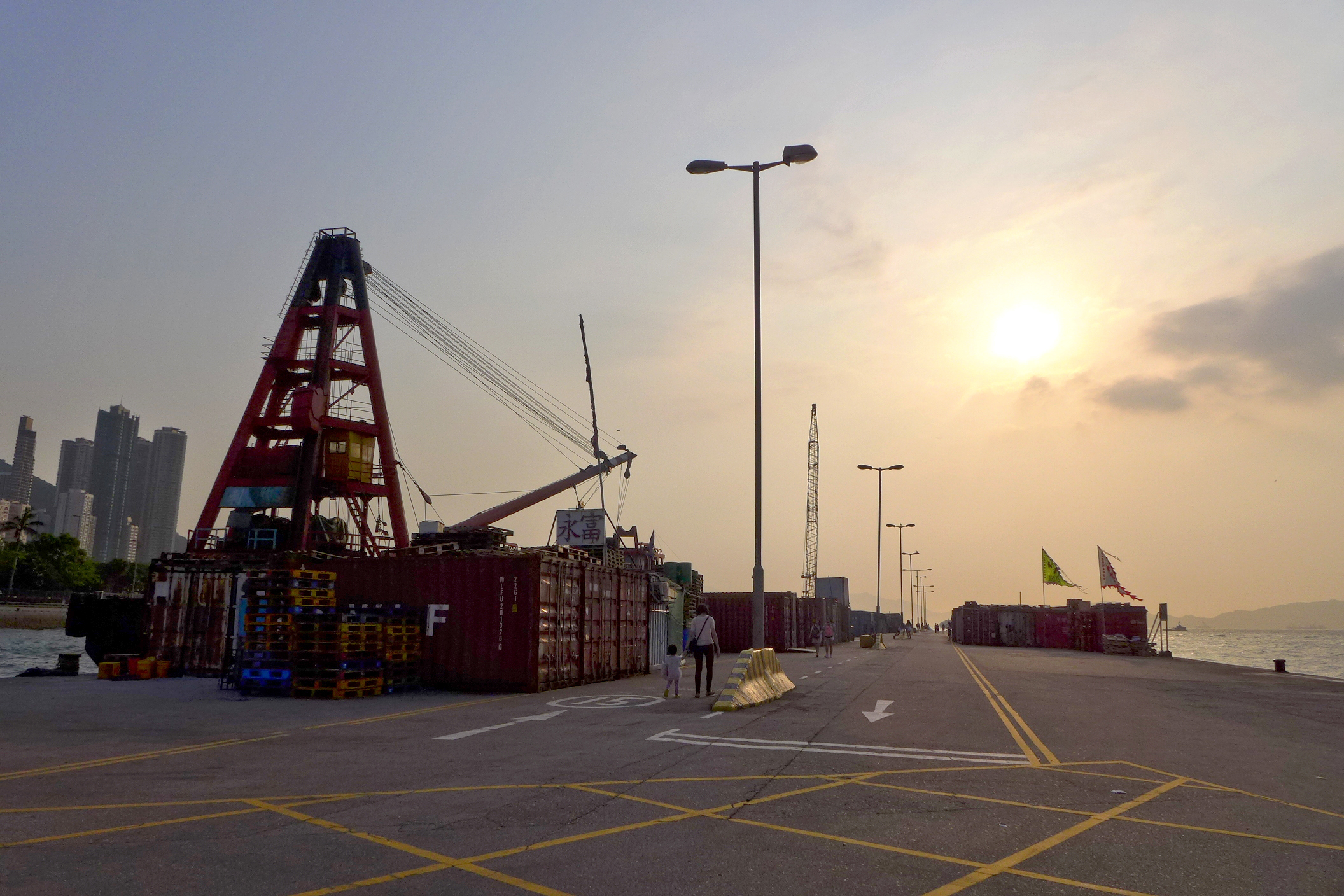 西環碼頭在夕照下是安寧的,在晨曦裏卻忙碌起來。大大小小的吊車起落有致,裝貨卸物的鏟車來回穿梭。濱海公園伴隨落日餘暉的散步者,換成了跳舞打太極的晨練者,有的熱辣,有的舒緩。海灣裏來來往往的船隻,一改夕照下的悠閒,禦風踏浪,掠波而去。