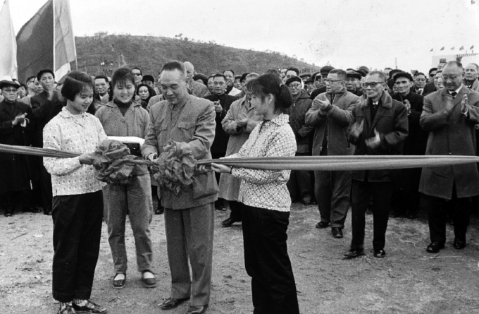 ▲圖為1965年2月27日,廣東省副省長林李明在東江—深圳供水首期工程竣工典禮上剪綵。後排右起:香港中華總商會副會長王寬誠、香港工聯會會長陳耀材、香港中華總商會會長高卓雄。