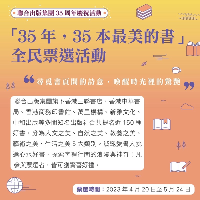 聯合出版集團舉辦之「35年,35本最美的書」全民票選活動,由香港中華書局與多間知名出版社合共提名近150種好書,分為人文之美、自然之美、教養之美、藝術之美、生活之美5大類別。誠邀愛書人於4月20日至5月24日期間參與票選活動,挑選心水好書。品味不同類別圖書設計中的巧思與美感,一同尋覓書頁間的詩意,喚醒時光裏的驚艷。
