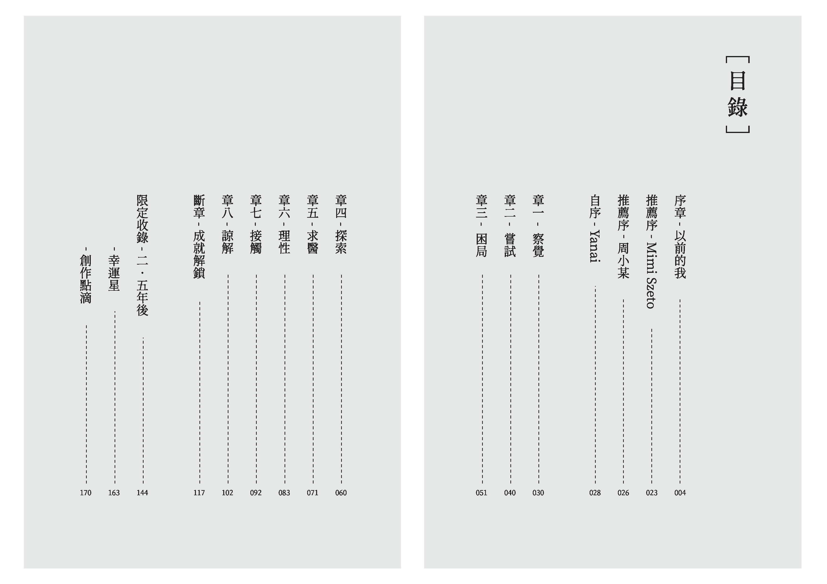 2021年推出自傳作品《自□》,同年底於荔枝角舉辦「《自□》Yanai 原稿展」,後在網絡漫畫平台Penana 刊登,迴響不俗。隨後曾在英國曼徹斯特舉辦「Self__ in Manchester」(《自□》英文版及原稿展),並在法國推出法文版單行本,獲良好口碑。